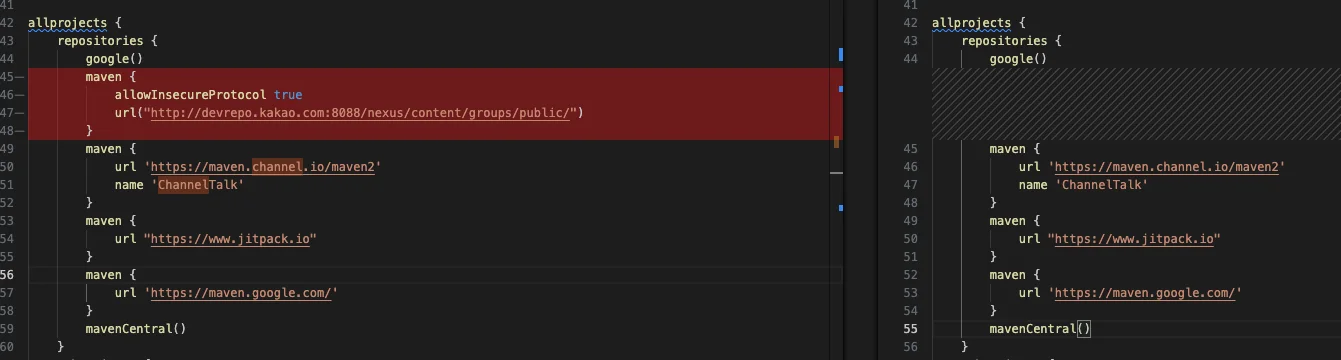 해결을 위해 android/build.gradle 파일을 수정해야 했다. 기존의 Maven Central 설정을 새로운 Channel Talk repository 설정으로 업데이트했다.