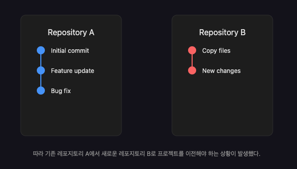 - 기존 레포지토리 A의 커밋 히스토리를 모두 유지해야 했다.
